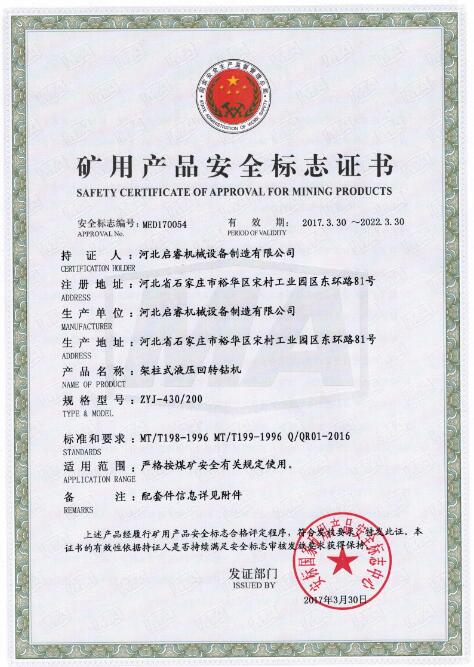 陜西榆林楊經理礦上需要3臺液壓探水鉆機,產品經理了解其地質環境、作業需求后推薦的ZYJ-430/200液壓架柱式回轉鉆機。楊經理確認打孔深度、鉆孔直徑等這些實際性能符合需求后,才想起問是否有安全證書,礦上只采購有安全證書的設備,沒有安全證書,性能再好、價格再實在也不行!!啟睿必須自信的回答:有啊!咱ZYJ-430/200液壓架柱式鉆機可是有“身份證”的鉆機!