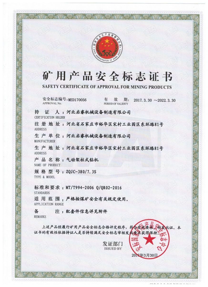 山西晉城新開的礦需要采購(gòu)一大批煤礦機(jī)械設(shè)備,啟睿銷售人員恰好在晉城簽一批手持鉆機(jī)的合同,從客戶那了解到這個(gè)新礦的招標(biāo)情況,就按照招標(biāo)要求送去了氣動(dòng)架柱式鉆機(jī)的材料。啟睿的氣動(dòng)架柱式鉆機(jī)有安標(biāo)證,通過了ISO9001質(zhì)量管理體系認(rèn)證,符合礦方采購(gòu)要求。