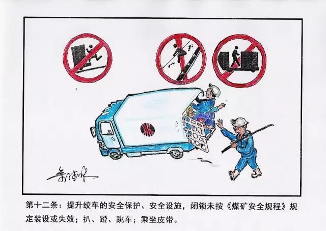 12、提升絞車的安全保護、安全設施,閉鎖未按《煤礦安全規程》規定裝設或失效;扒、蹬、跳車;乘坐皮帶。