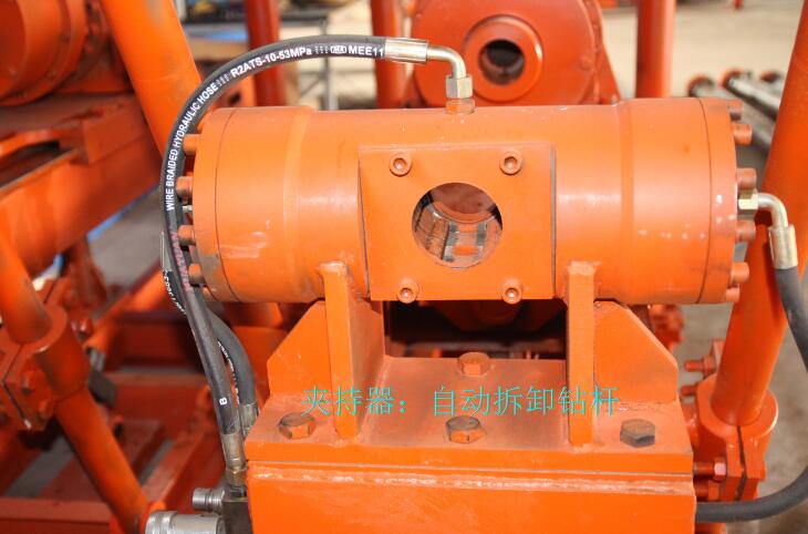 旋轉(zhuǎn)系統(tǒng)、夾緊系統(tǒng)、推進(jìn)系統(tǒng)全部液壓控制,自動(dòng)上、卸鉆桿,減輕了操作工人的勞動(dòng)強(qiáng)度。夾緊卡盤、變速箱系統(tǒng)一體化設(shè)計(jì),夾緊油缸外置,卡緊力大,便于拆裝維修。推進(jìn)油缸采用雙出頭油缸設(shè)計(jì),具有推進(jìn)行程長的特點(diǎn),推進(jìn)行程可達(dá)到880mm。液壓系統(tǒng)采用雙泵供油回路系統(tǒng),推進(jìn)、旋轉(zhuǎn)互不影響。油泵、馬達(dá)、操作閥等核心部件均采用可靠廠家。鉆孔傾角在 ±90°范圍內(nèi)可調(diào),鉆孔300米完全沒問題。