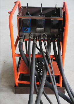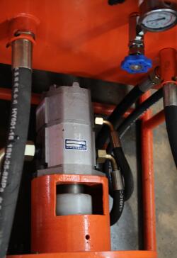 全機由主機、操作臺和泵站三大部分組成,各部分之間用高壓膠管連接全機由主機、操作臺和泵站三大部分組成,各部分之間用高壓膠管連接。而泵站主要有隔爆型電動機、雙聯齒輪泵、溢流閥、壓力表和油箱組成。電動機啟動,液壓油從油箱經濾油器進入雙聯齒輪泵;齒輪泵輸出主泵和付泵兩聯高壓油,分別進入控制操作臺,主泵供給液壓擺線馬達、付泵供給推進油缸和頂緊油缸液壓油。