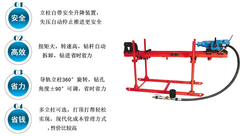 ZQJC-220/6.0S氣動架柱式鉆機產品簡介 類別:氣動架柱式鉆機 型號:ZQJC-220/6.0S 品牌:河北啟睿 用途:ZQJC-220/6.0S氣動架柱式鉆機是動力頭式鉆機,主要使用高效螺 旋鉆桿和硬質合金鉆頭回轉鉆進,以壓縮空氣為動力,給進、回轉采用獨 立馬達帶動,轉速高,扭矩大,有重量輕、結構簡單、維修方便等特點。 廣泛用于煤礦煤層探水、探排瓦斯孔的施工。