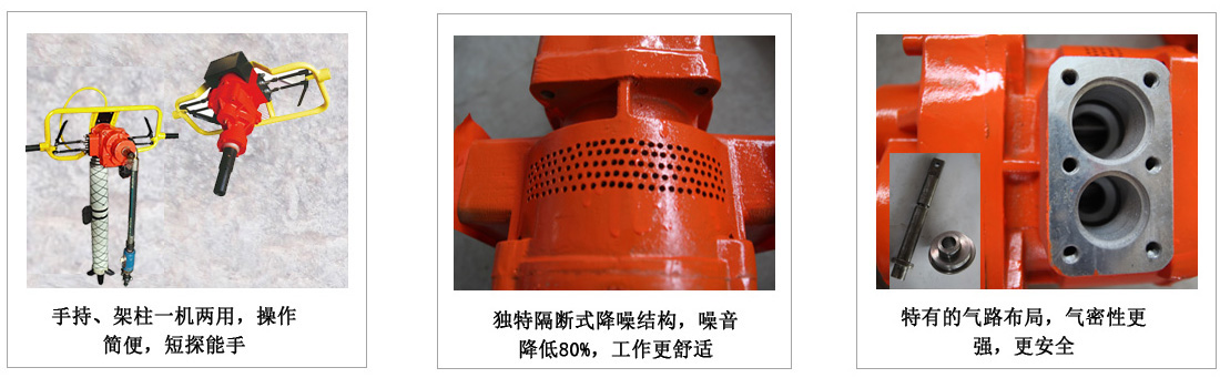 ZQSJ-140/4.1氣動手持式鉆機產品簡介 類別:氣動手持式鉆機 型號:ZQSJ-140/4.1 品牌:河北啟睿 用途:該氣動手持式鉆機為便攜式,它具有安全防爆、轉矩大、帶有反轉、 轉速高、質量小、效率高、結構簡單、維修方便等特點。因此本鉆機工作 效率高、支護質量好、工人勞動強度低、進尺費用少,所以它是煤礦行業 必備設備之一。該機主要用在探測地質構造煤層、探放水、瓦斯、煤層注 水、卸放壓力孔,巷道幫錨桿孔的鉆孔及描桿的攪拌和螺母的安裝。也可 用于巖巷樹脂錨桿的攪拌及螺母的安裝。